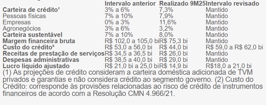 O Banco do Brasil revisou suas projeções corporativas para 2025, conforme a tabela a seguir: