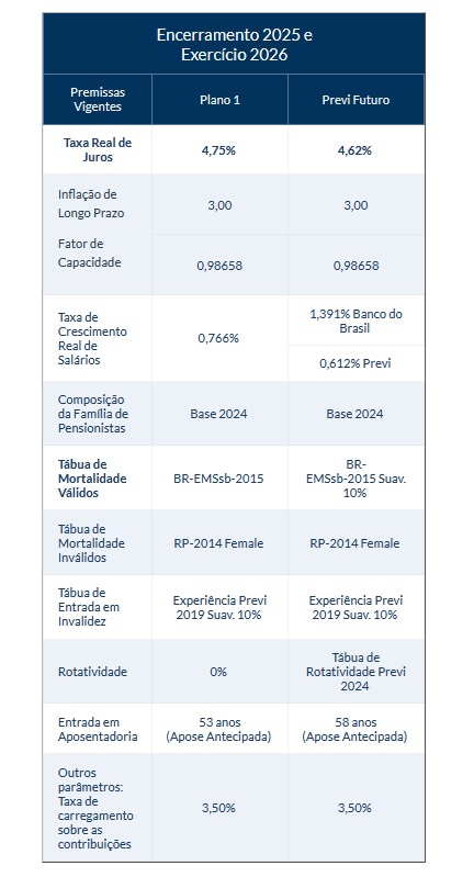 A partir da realização dos estudos técnicos previstos na Gestão do Risco Atuarial para o Exercício de 2025, a Previ informa que serão mantidas as premissas atuariais utilizadas atualmente, tanto no fechamento do exercício de 2025 quanto ao longo de 2026, para todos os Planos de Benefícios.