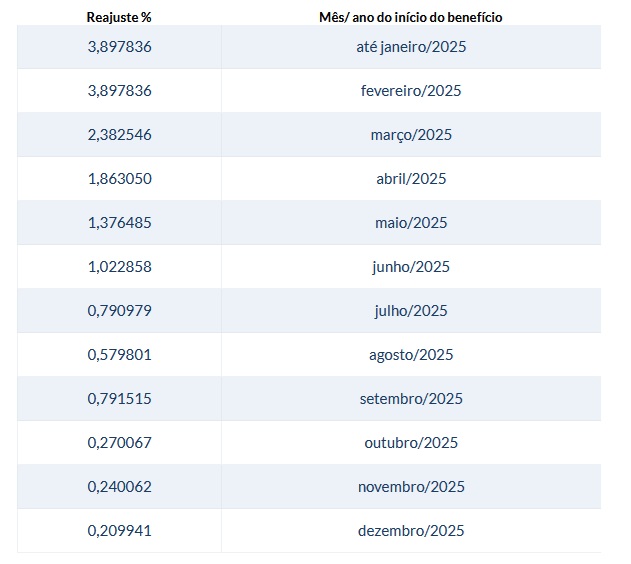 Confira abaixo os percentuais de reajustes conforme o mês de início do benefício: